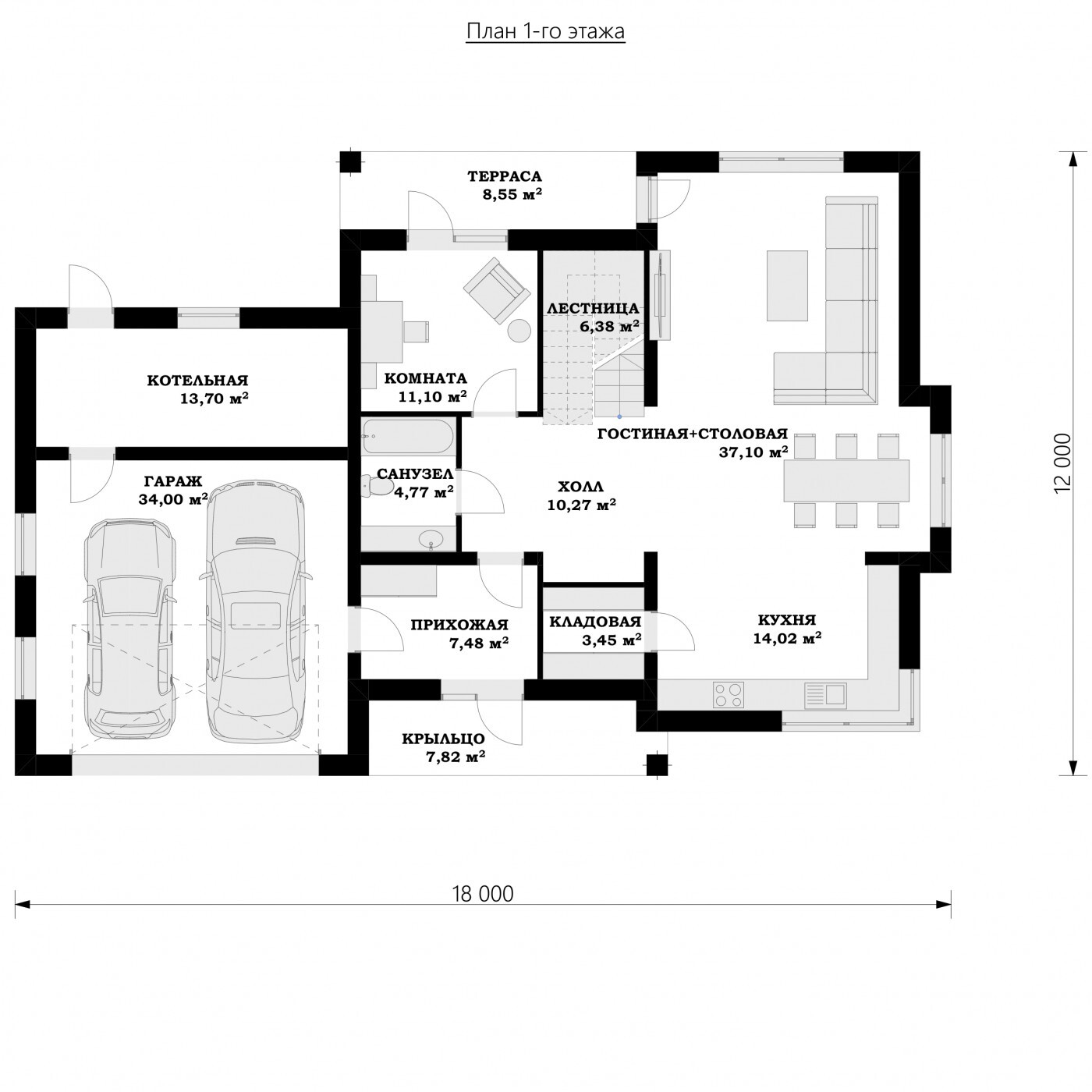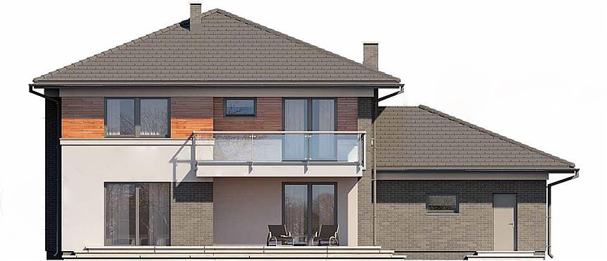 "Манчестер"- проект представительного двухэтажного дома для семьи из 5 человек. Это типичная городская резиденция с современным обликом и оптимальной полезной площадью. Он имеет богатую функциональную программу, расположенную на двух этажах, что обеспечит комфорт даже для требовательных инвесторов. Первый этаж был спроектирован как открытое жилое пространство, состоящее из объединенной гостиной, столовой и кухни. Здесь также есть дополнительная комната, которая может быть использована как кабинет или дополнительная спальня. На первом этаже также есть большая котельная, для каждого вида топлива и гараж на две машины. На первом этаже расположены 4 спальни, ванная комната и прачечная. Проект дома 18 на 12 впечатляет утонченной, неподвластной времени классической формой, воплощенной в современном элегантном образе.