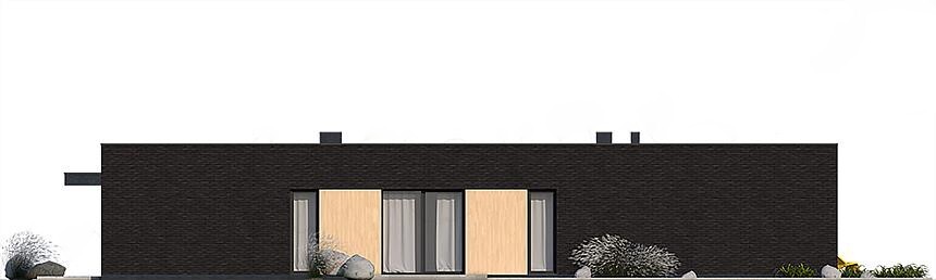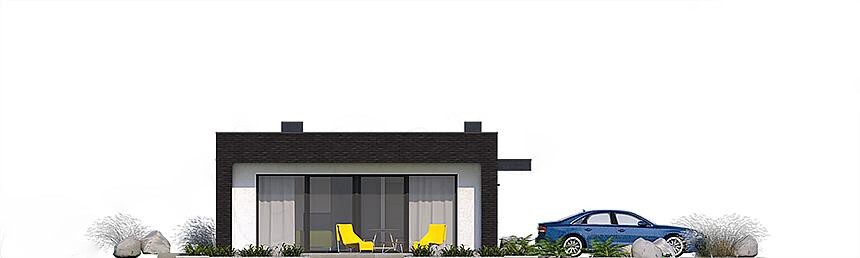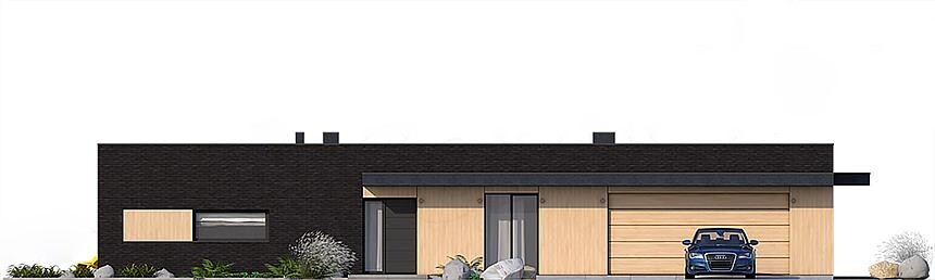 Современный небольшой одноэтажный дом для одной семьи, без подвала, с гаражом на два авто и частично крытой террасой. Проект дома имеет размеры 8 на 19 метров и выполнен в стиле high-tech с плоской крышей.