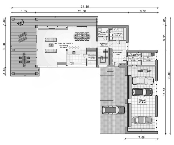 Площадь первого и второго этажей, с учетом террас, крылец, балконов и гаражей