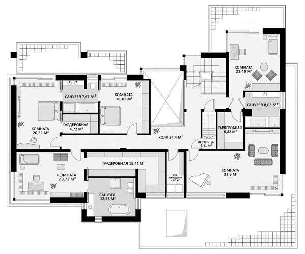 Фундамент - ребристая плита "перевернутая чаша": • Толщина плиты – 200мм • Высота ребра: 300 мм; • Бетон М350 (В25) • Рабочая арматура А500С – 12мм • Армирование плиты в два уровня ячейкой 200х200мм • Гидроизоляция плиты – профилированная мембрана Planter . Щебеночное основание 100мм • Песчаная подушка – 300мм • Геотекстиль по основанию песчаной подушки • Закладные трубы коммуникаций • Устройство канализационной трассы с выводом за пределы фундамента;