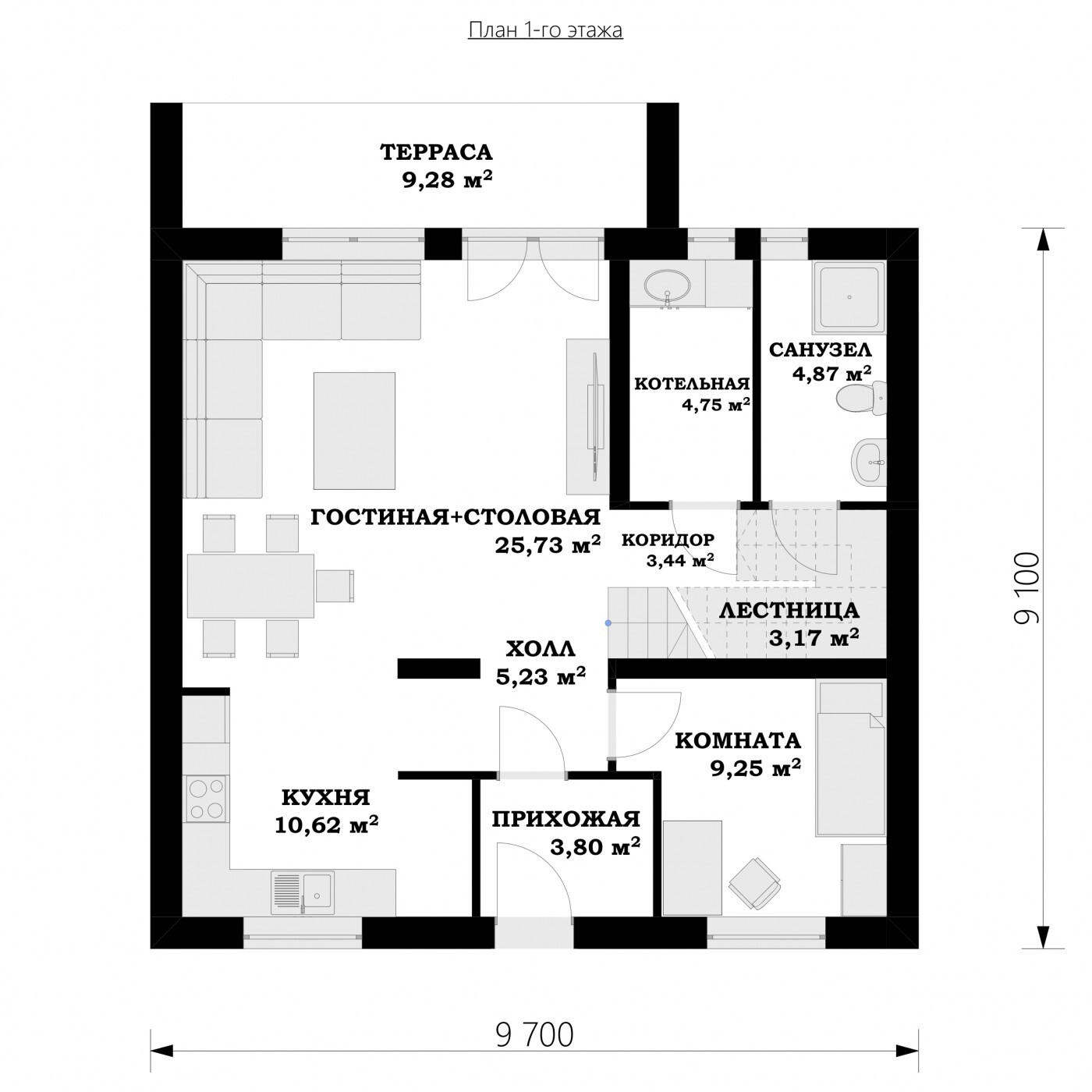 Дом 9х9 "Алаво" - проект одноэтажного дома с мансардой, для семьи из 4-5 человек. Это предложение дома с часто ищущейся площадью около 110 м2. Как и другие проекты этой серии, дом "Алаво" был разработан с разделением на две полезные зоны, обычно доступные на первом этаже, и частную на чердаке. На первом этаже у нас есть прихожая со встроенным шкафом, прихожая, кухня с кладовой, гостиная со столовой и камином, а также комната, расположенная в передней части дома для использования в качестве кабинета. У лестницы, ведущей на чердак, была котельная с прачечной и удобная ванная комната. На чердаке у нас есть три благоустроенных комнаты, каждая с собственным балконом. Здесь также был спроектирован небольшой чердак с возможностью использования в качестве гардероба и полностью доступной ванной комнаты с доступом к нему. Чердак спроектирован под двускатной крышей, спроектированной на традиционной ферме, основанной на локтевой стене высотой около 1 метра. План дома является идеальным предложением для энергоэффективного дома, дешевого в строительстве и использовании. Большим преимуществом дизайна является простой дизайн дома и хорошо продуманная функция.