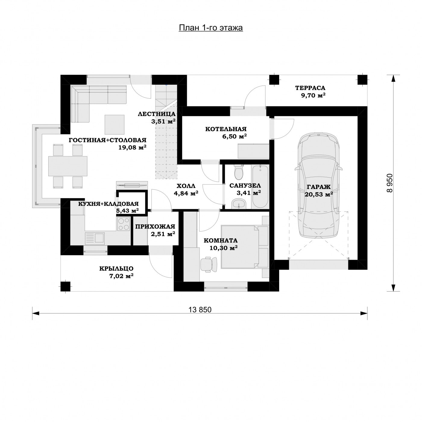 Проект одноэтажного дома 14 на 9 "Ричмонд" - интересное предложение для людей со средней шириной участка. Корпус здания имеет простую форму, поэтому он будет хорошо смотреться независимо от окружения. Проект был создан для земельных участков, позволяющих отдельно стоящие здания. Автор проекта включил гараж на одну машину в линию строительства. Это также отличное предложение для тех, кто ищет дом с тентовой крышей, который относится к самым прочным конструкциям крыши. Проект "Ричмонд" - это одноэтажный дом, благодаря которому обойти его очень удобно. Кроме того, можно адаптировать чердак, а назначение и расположение этой области зависит только от фантазии инвестора. Ежедневная часть, включенная в проект, наверняка удовлетворит людей, которые любят наслаждаться общими моментами со своей семьей. Это создает, среди прочего, кухню, которая будет идеальным решением для традиционных и современных домохозяек. Жилая зона включает в себя гостиную и столовую, благодаря чему интерьер дома очень функциональный. Камин, расположенный в гостиной, сделает интерьер более уютным. Ванная комната на первом этаже имеет оптимальные размеры. Дизайн включает в себя одну просторную и функциональную спальню. Еще можно устроить на чердаке. Непрерывность между интерьером дома и сада обеспечивает привлекательную террасу. Здание было спроектировано по кирпичной технологии. Его внешний вид относится к традиционному стилю, который идеально подходит для людей, которые ценят классику и простоту.